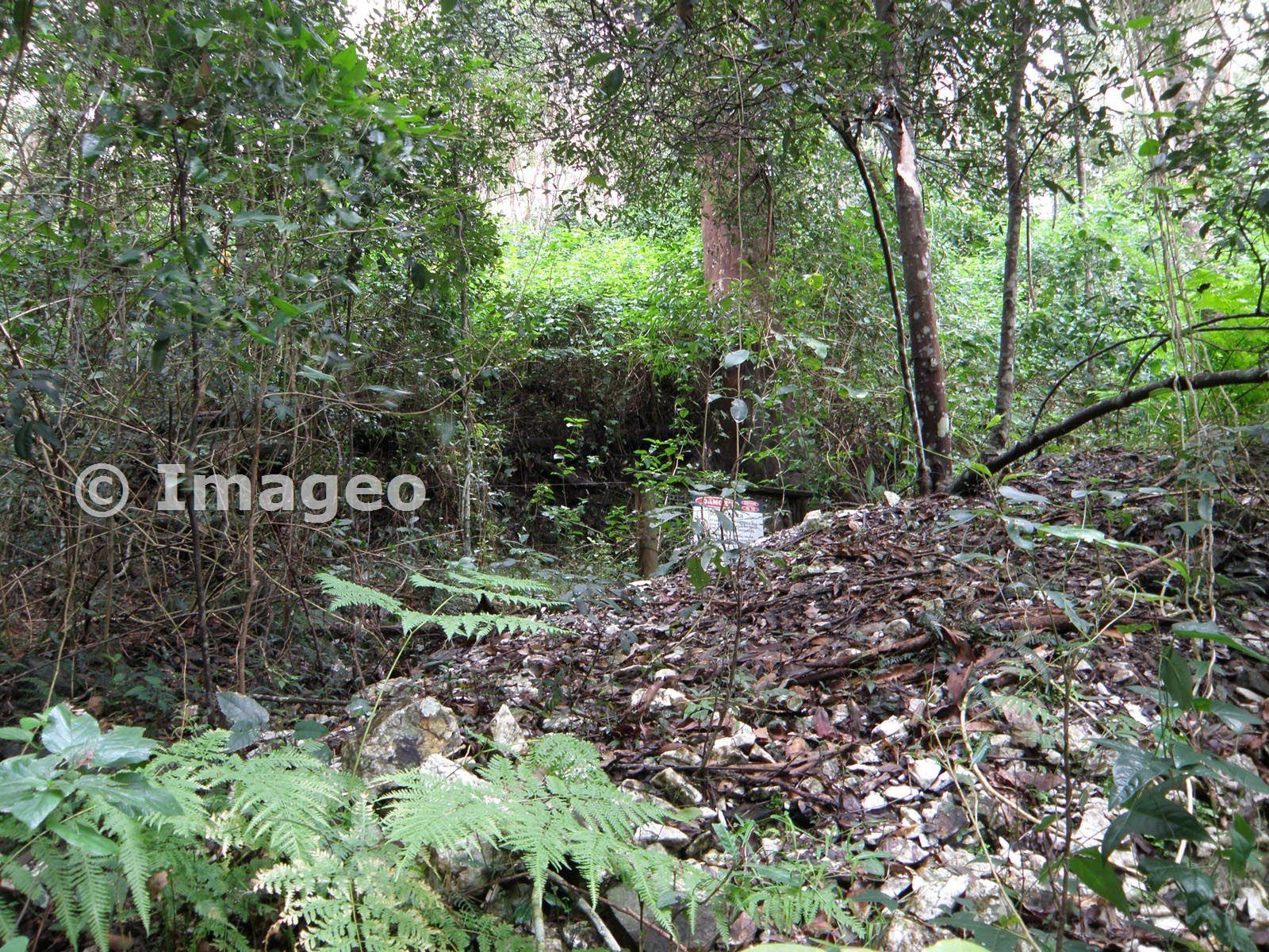 View from adjacent gully showing quartz rich waste dump and fencing around mouth of shaft.