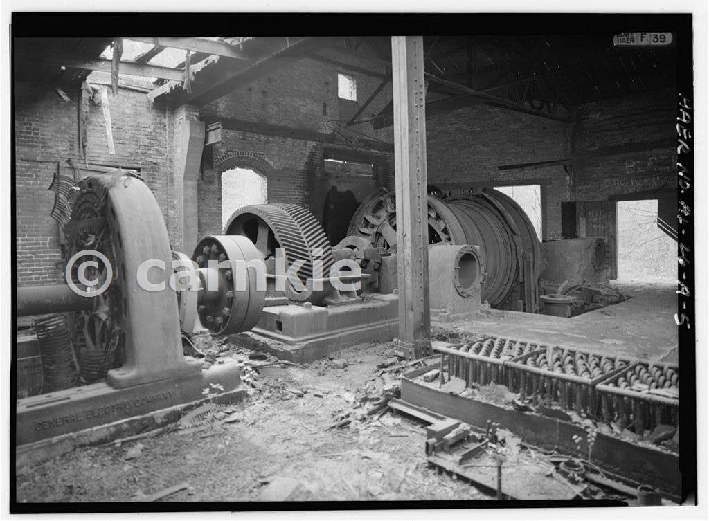INTERIOR VIEW SHOWING ENGINE (LEFT), DRIVE SHAFT (CENTER), AND HOIST DRUM (RIGHT), LOOKING SOUTH. Courtesy of the Library of Congress, HAER ALA,37-BIRM V,15A.5