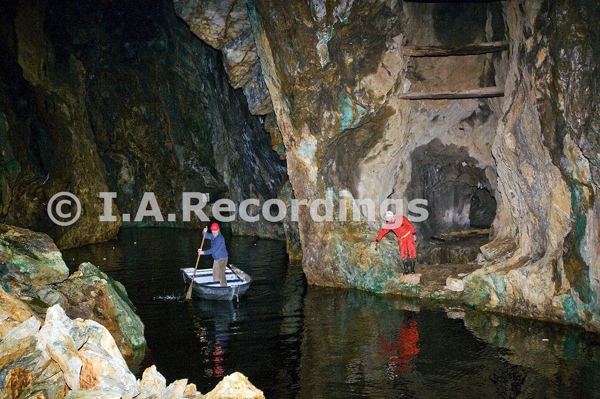 Boating in the North-South flooded stope at Main Adit level to reach the level by Skip shaft landing on the East side of the stope (where the figure is). [October 2012]