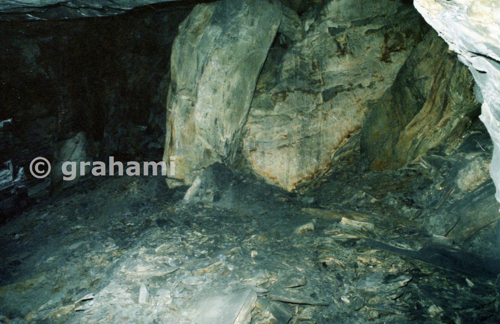 This is what we saw - the remains of the "Great Fall" of 1882-83 which brought the Welsh Slate Company to its knees. Great slabs hung down from where the roof had broken. It was an eery feeling - especially in the silence.