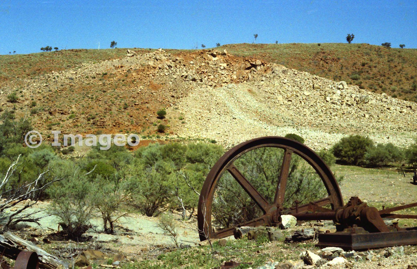 Flywheel from crushing plant is seen and scar on the hillside (near where the shaft would have been) is very obvious. Photos date from ca. 1982.