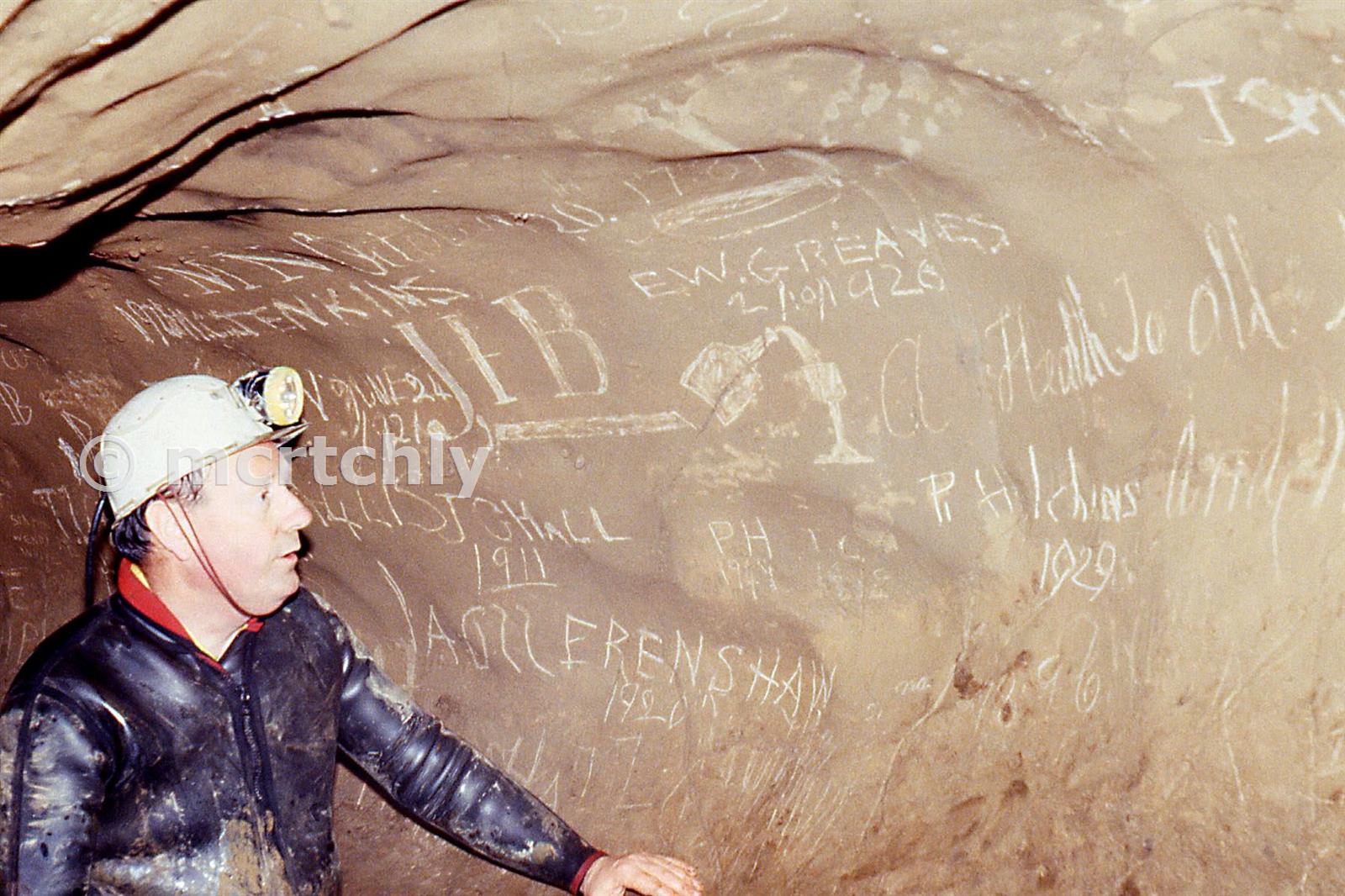 Trevor looking at the graffiti including the C18th toast to the miners
