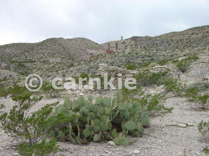 Creosote bush and prickly pear cactus grow amongst the ruins of the old mine buildings of the Mariscal Mine. The mercury mine was active in the early 20th Century. It is located along the River Road in southern Big Bend National Park. Courtesy U.S. Geological Survey. The USGS home page is http://www.usgs.gov