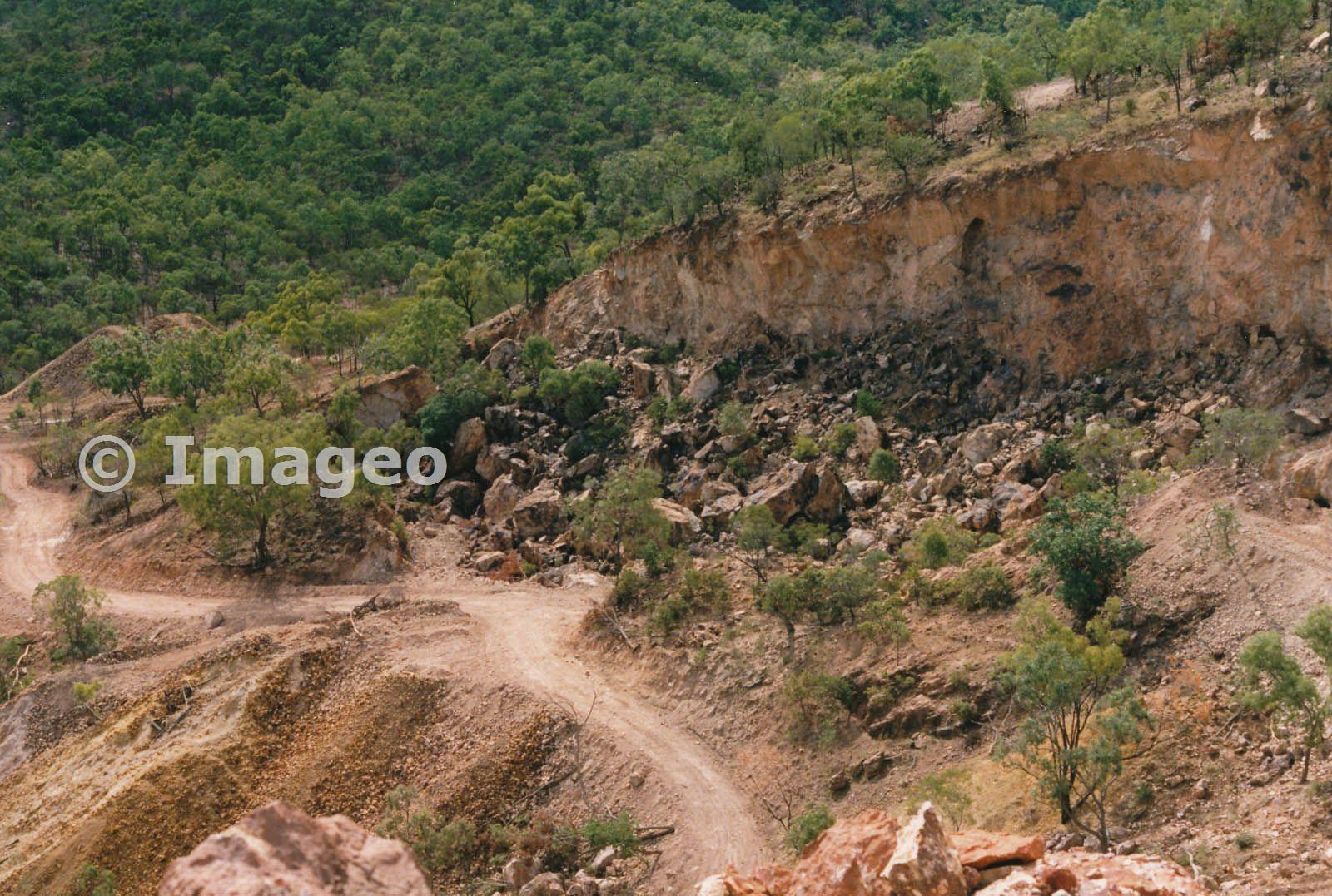 A view down into the 'old open cut' which was actually a collapsed room and pillar operation dating back to the early 20th Century, north side of the hill, 1986 - 1987.