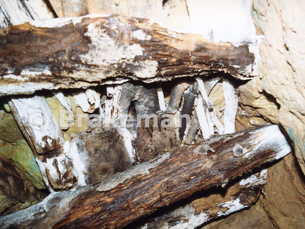 At the far end of the level beyond Blue shaft, some original timbering remains in place with a substantial amount of miners spoil on top, circa 1987