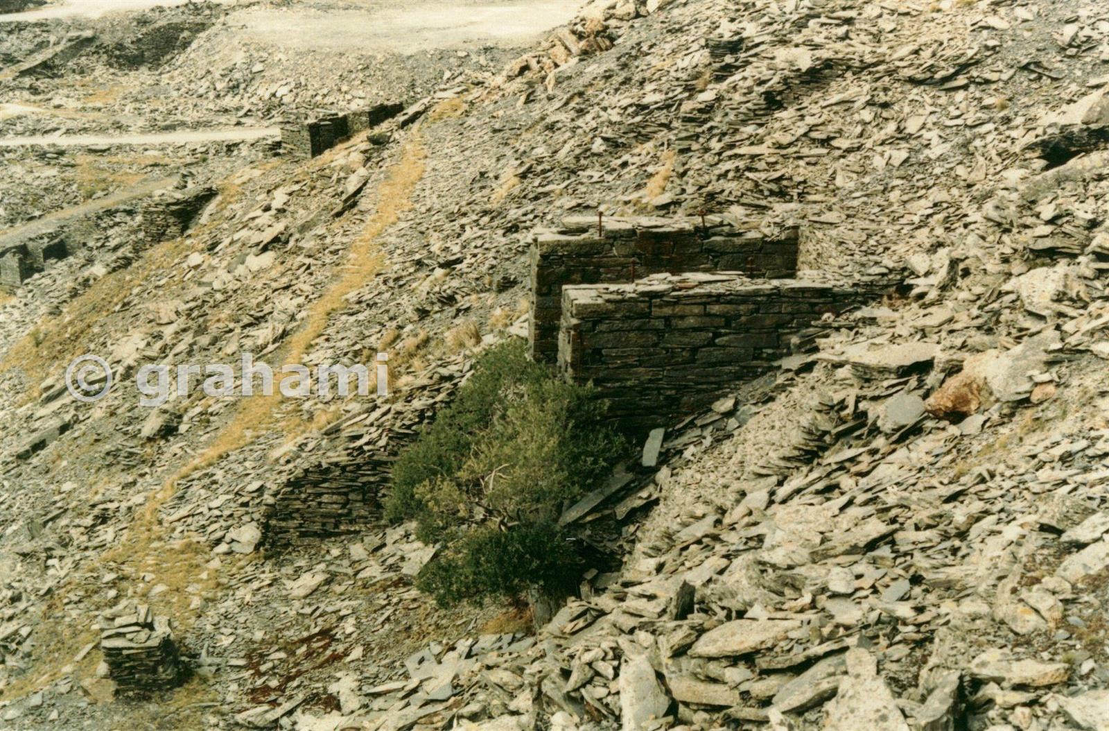 The drumhouse for the "Long Water Balance" was situated much higher up then the actual head, which was at the level of the green track that can be seen. There was a bridge here across the incline, and the track arrangement at the head was changed from the original - heading away from the camera - to heading towards the camera to a negotiated tip on Diffwys floor 0