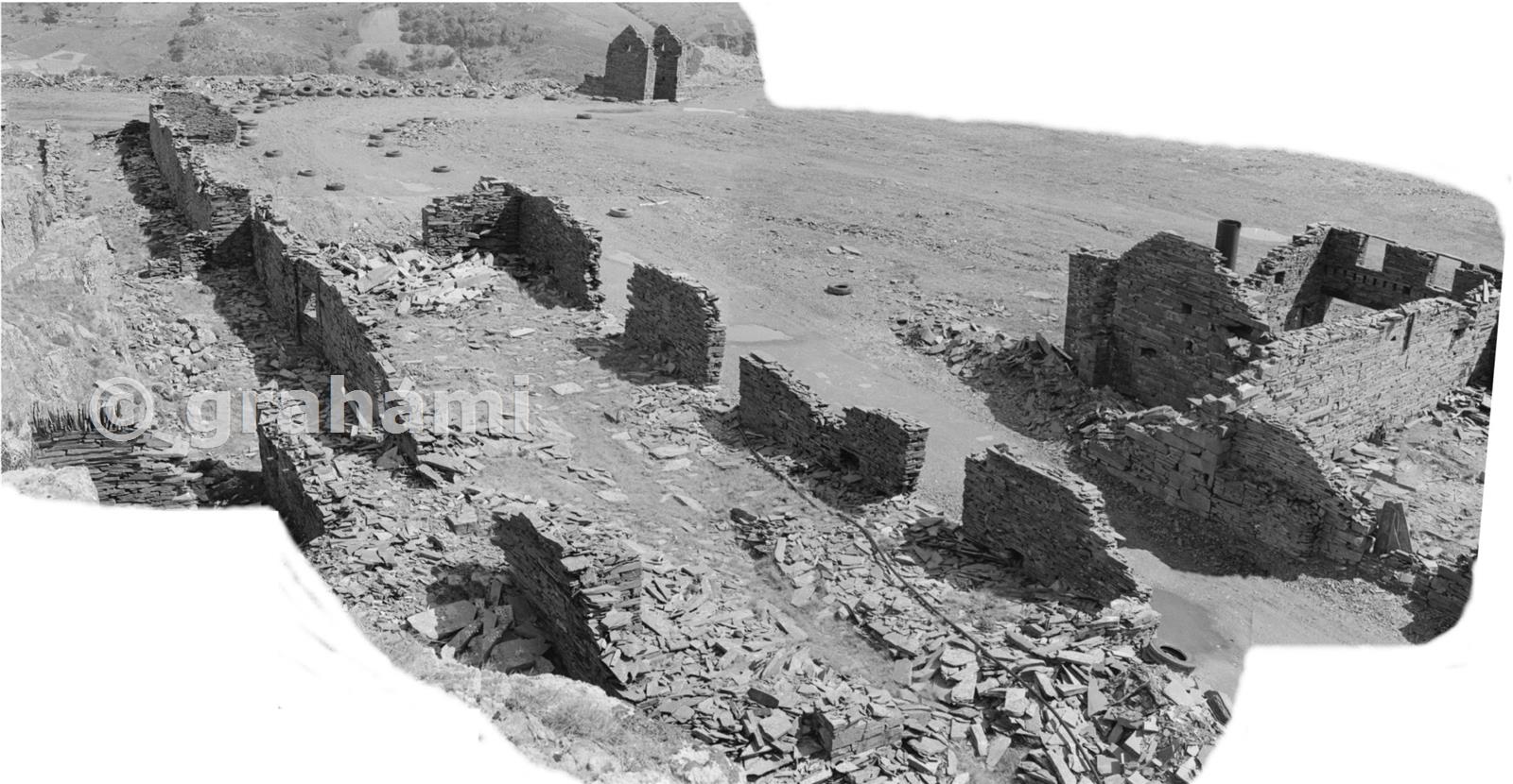 This photo shows the remains of the old mill with the engine house of the new mill on the right. Both were originally steam driven as there was little water available on this side of the Hollands'' quarry site. In the background is the drumhouse of the 1880s incline which was built to connect the upper and middle quarry in Oakeley days.