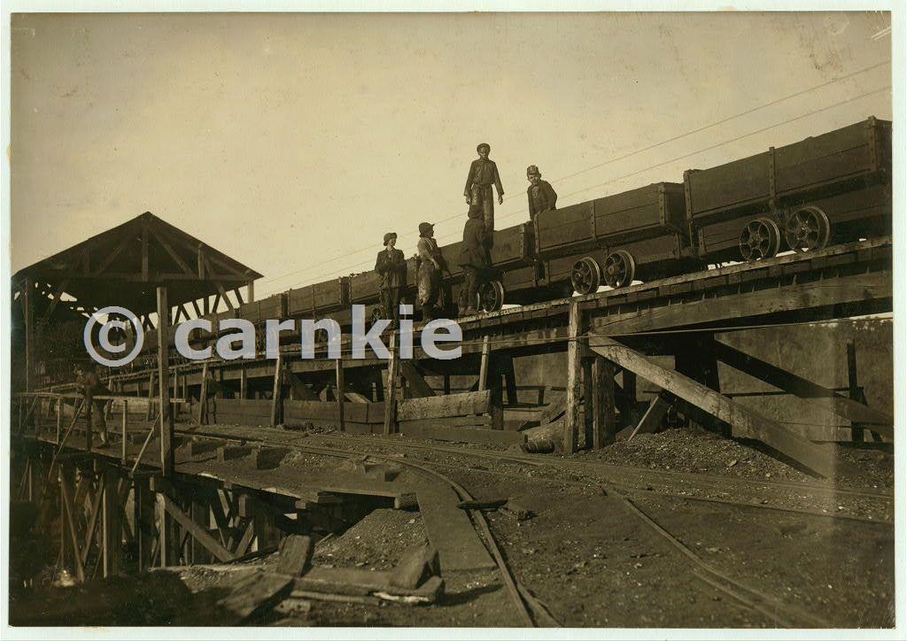 On the tipple at the Bessie Mine, Sloss-Sheffield Steel & Iron Co. These young boys work around and on these coal cars, loaded and empty, while they are running at full speed. It is dangerous. One of these boys said, "Ain't hardly a day goes by that someone don't get pinched or hurt." "I got my leg jammed a while ago and was laid up a week.".