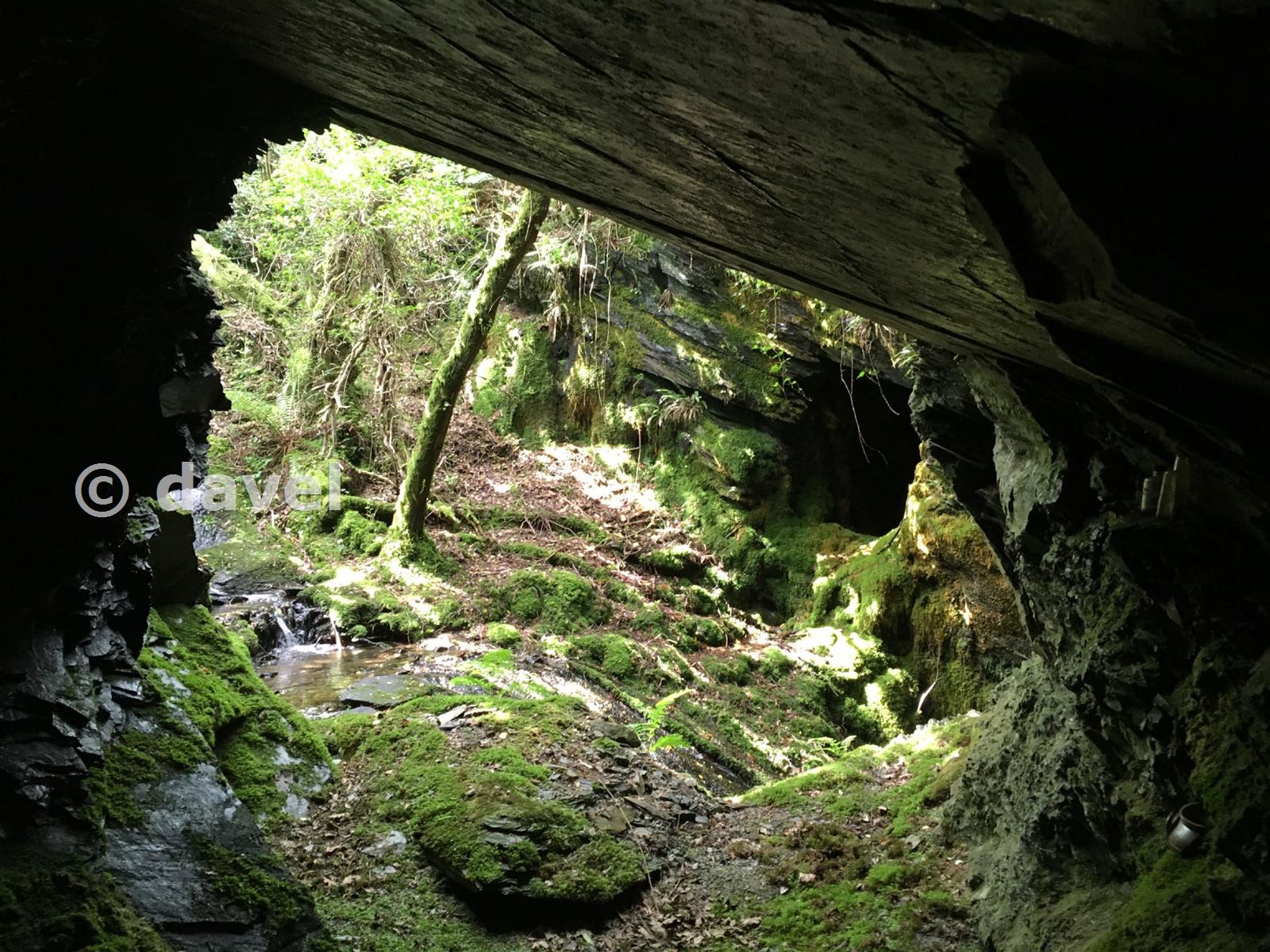 Looking across open chamber from upper adit to short continuation level. Chamber continues downwards on right and is drained by a lower level.