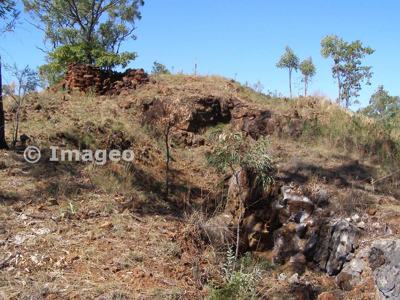 A view west showing one of the smaller open cuts and the old hut at the top of the hill. This may be the 'Magazine workings'.