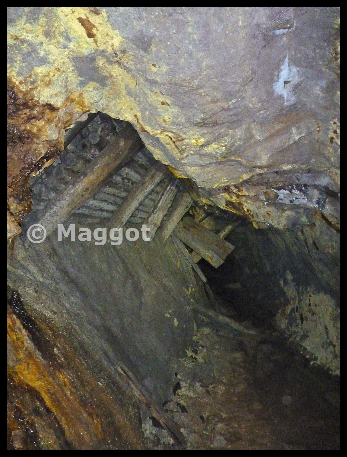 Slightly less intact ore chute with timbering. No 4 Level.