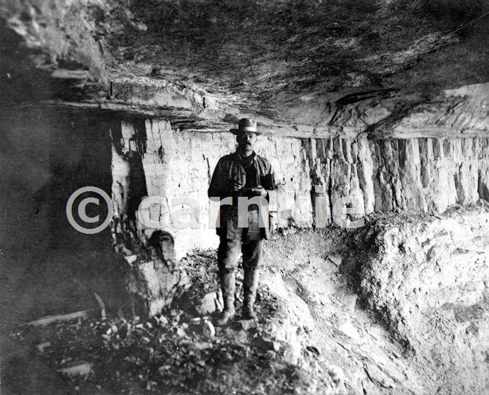 Outcrop of coal at entrance to Ballards Mine showing jointing of coal, M.R. Campbell provides scale. Credit: U.S. Geological Survey