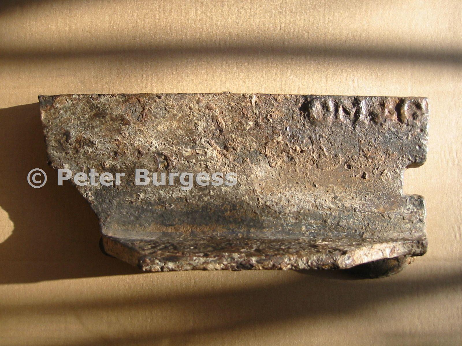 A broken fragment of an Outram gangrail cast at Butterley Furnace in about 1803 for use on the Croydon Merstham and Godstone Iron Railway. The letters CM&G are visible. Found in Godstone Quarries where some rails ended up and were used second hand until after 1900.