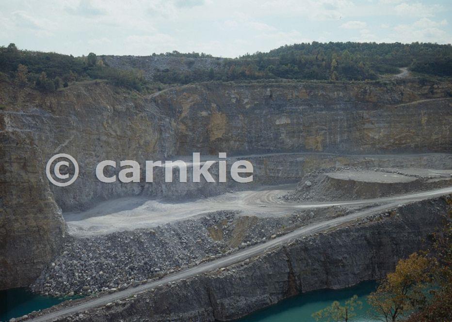 EXTERIOR OVERVIEW, LOOKING NORTH, OF THIS 400' DEEP LIMESTONE QUARRY PIT ('THE OLD PIT') WITH LEDGE PREPARED FOR LIMESTONE EXTRACTION. AN ELEVEN-HOLE SHOT WILL DISLODGE APPROXIMATELY 25,000 TONS OF LIMESTONE WHICH, AFTER LOADING AND CRUSHING, WILL BE USED FOR ROAD CONSTRUCTION. Courtesy Library of Congress, Prints & Photographs Division, HAER, Reproduction number HAER ALA,59-CAL,2-3