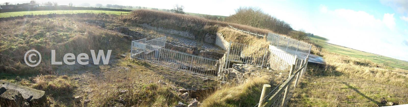 Panorama show showing are of pumping engine house showing the deeper parts of the engine house fenced to the left of the shaft (capped on the right of the photo). The base of the chimney visible to the far left of the photo, and the boiler house in the centre, behind the boiler house is the cobbled coal yard, and behind that in the background is the reservoir. Behind the shaft is the stone ore crushing circle (Dec 2009).