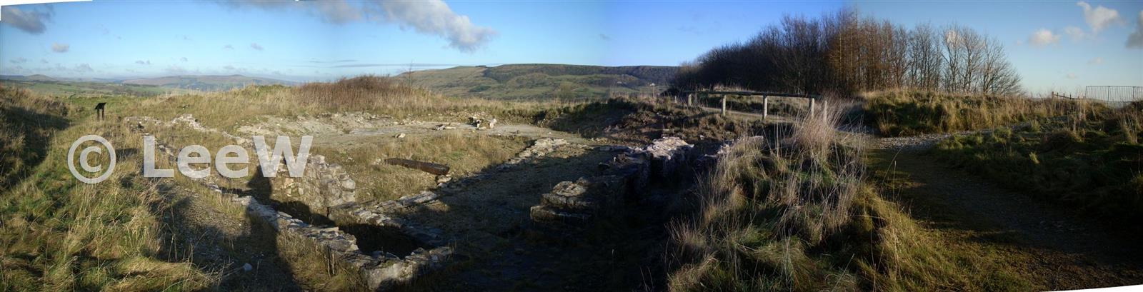 Panorama view of the remains of the steam engine house with the chimner base at the left side of the photo, the building remains are parts of the the steam engine house and the flat are behind is the ore processing area, the shaft and the fence and the pumping engine remains is on the far right of the photo. The raised area between the wooden and steel fence is the site of a capstan and possible horse gin circle (Dec 2009)