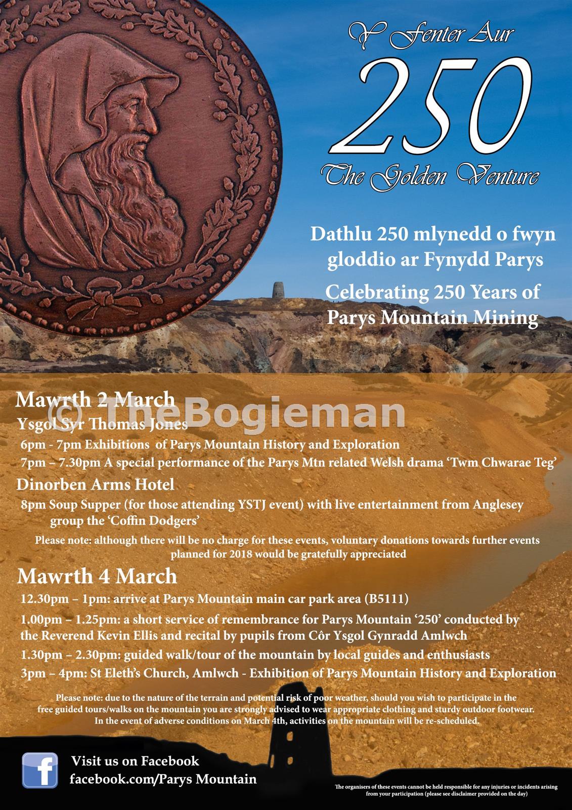 Poster showing events marking 250 yrs of modern mining on Parys Mountain