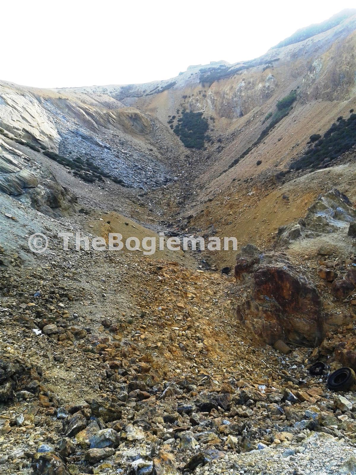 Mid looking SW. Visitor viewpoint at top of rim. Foreground was flooded with red, deep, acid water until the mine was drained in 2003. Many vehicles were dumped in the ''lake'' - all that remains of them are the tyres and any plastic bits!
