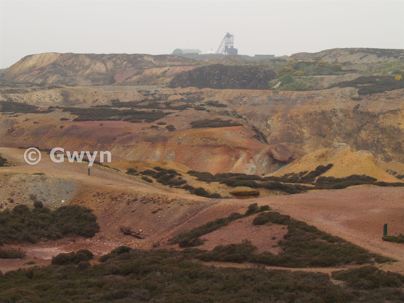 Landscape view over the Great Opencast, from Mona Mine Yard. Morris shaft headgear in distance.