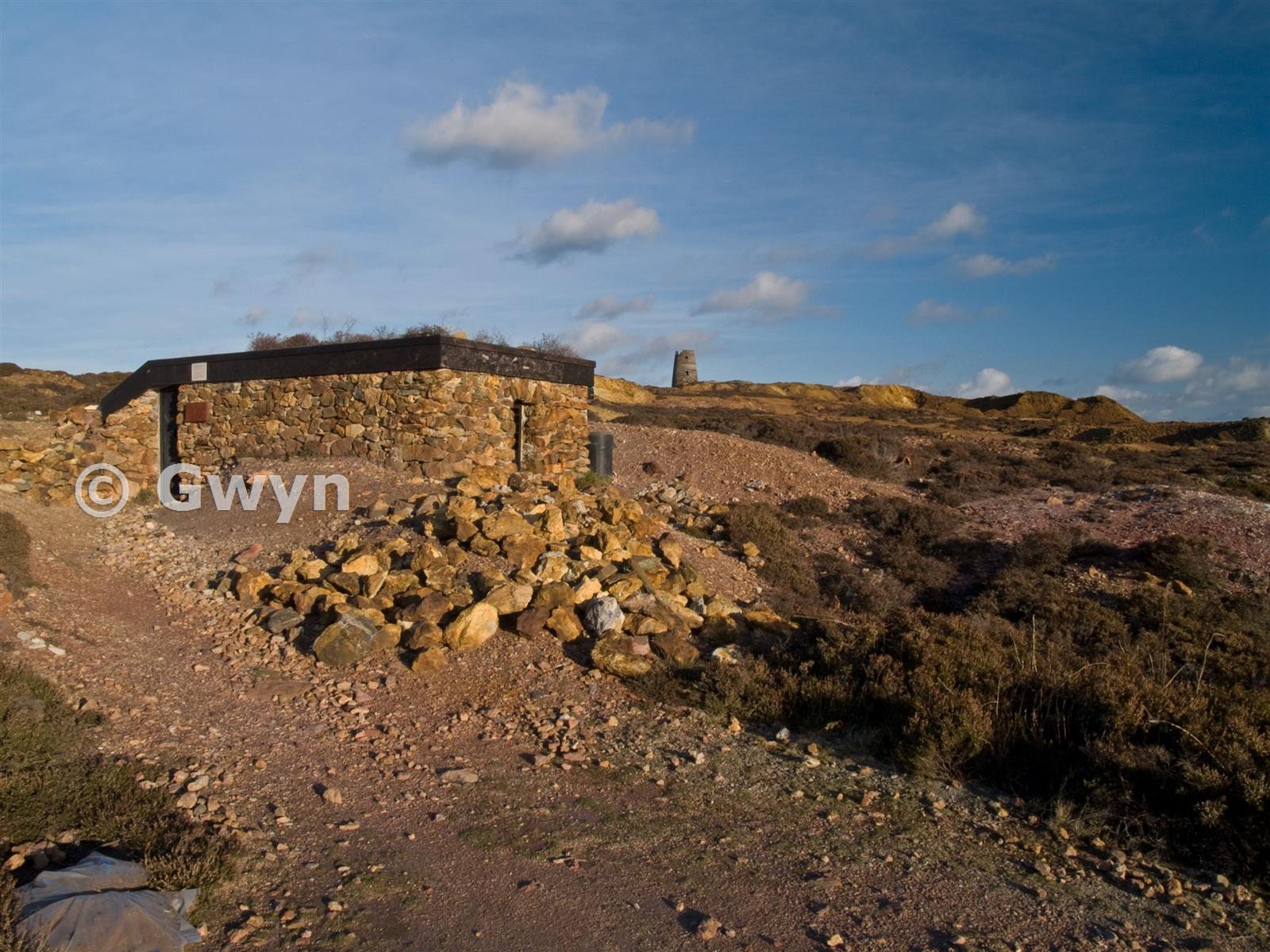 Landscape view. Parys Underground Group's "club & adit house" on the left. Summit Windmill in the distance. November. 2008.