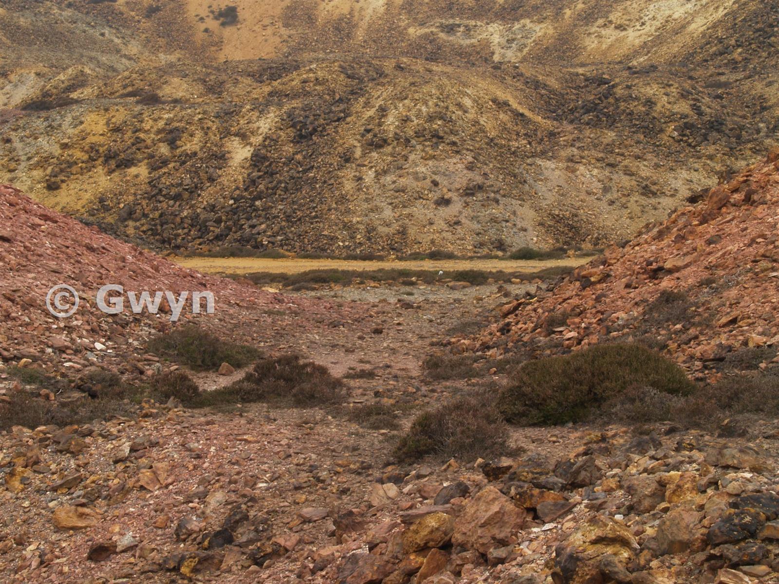 Landscape detail. The "pink" coloured stone has probably been calcined to extract sulphur. May. 2008.