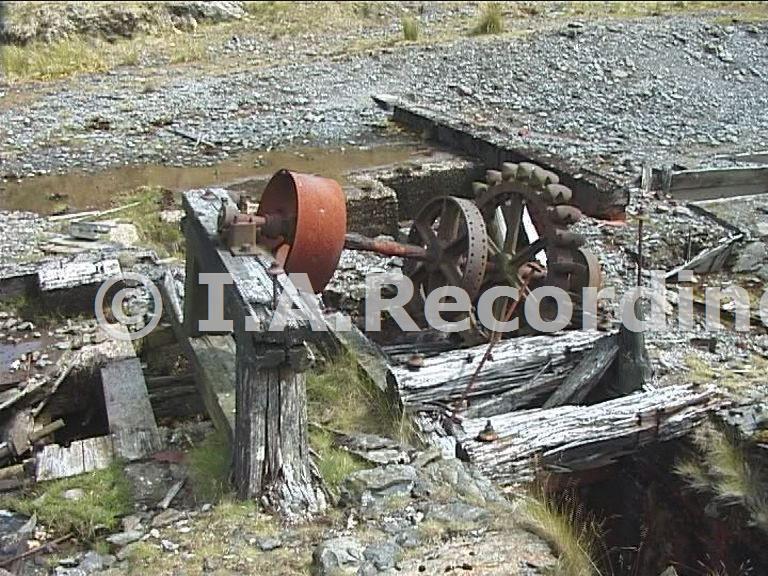 Pelton wheel, part of the remains of the c1900 water powered dressing floor equipment. [Grab from 12th July 2002 video]