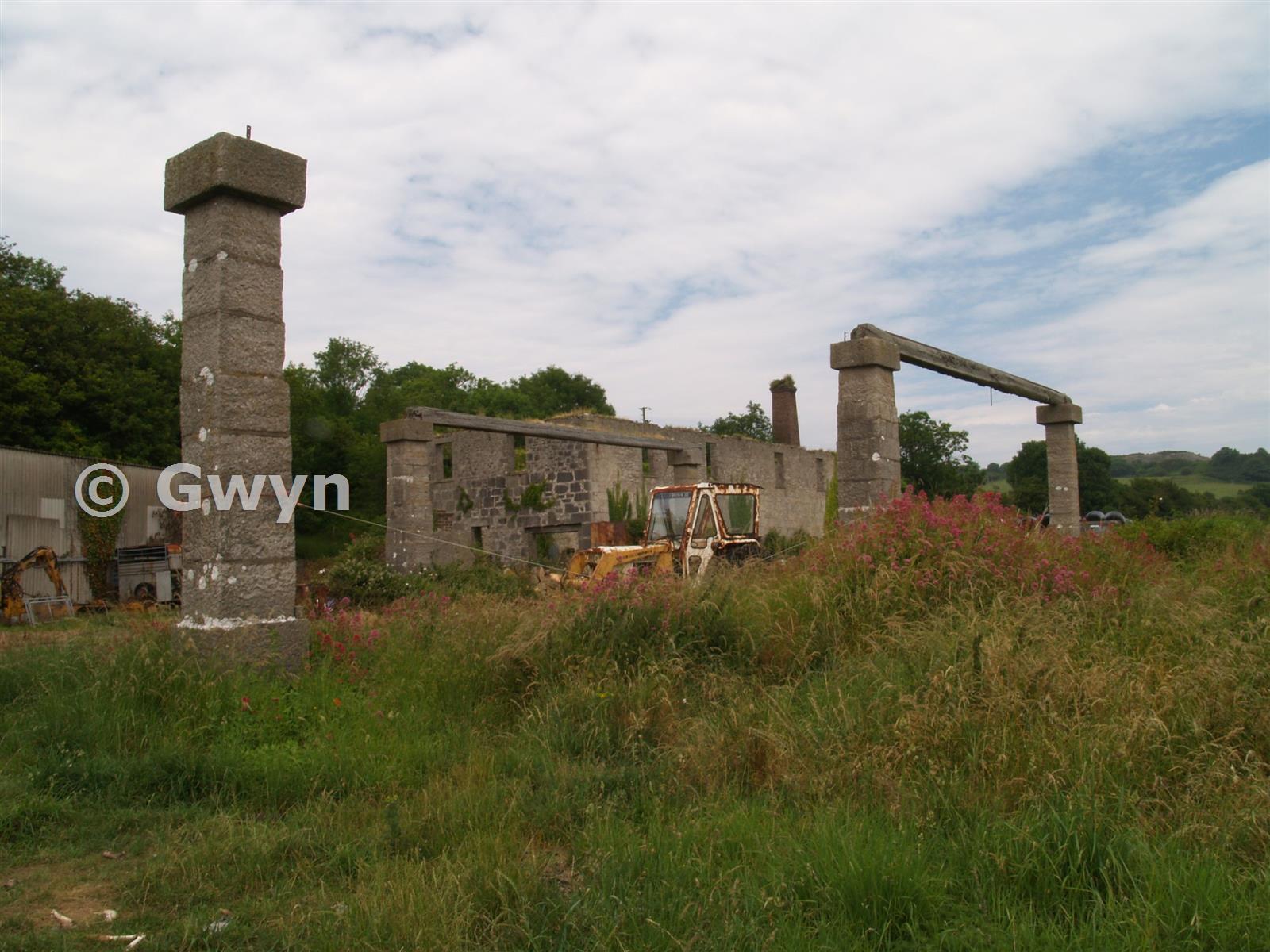 Stone pillars supporting large, timber cross beams used for loading/unloading produce. Mill/workshop building, with brick chimney, in background.