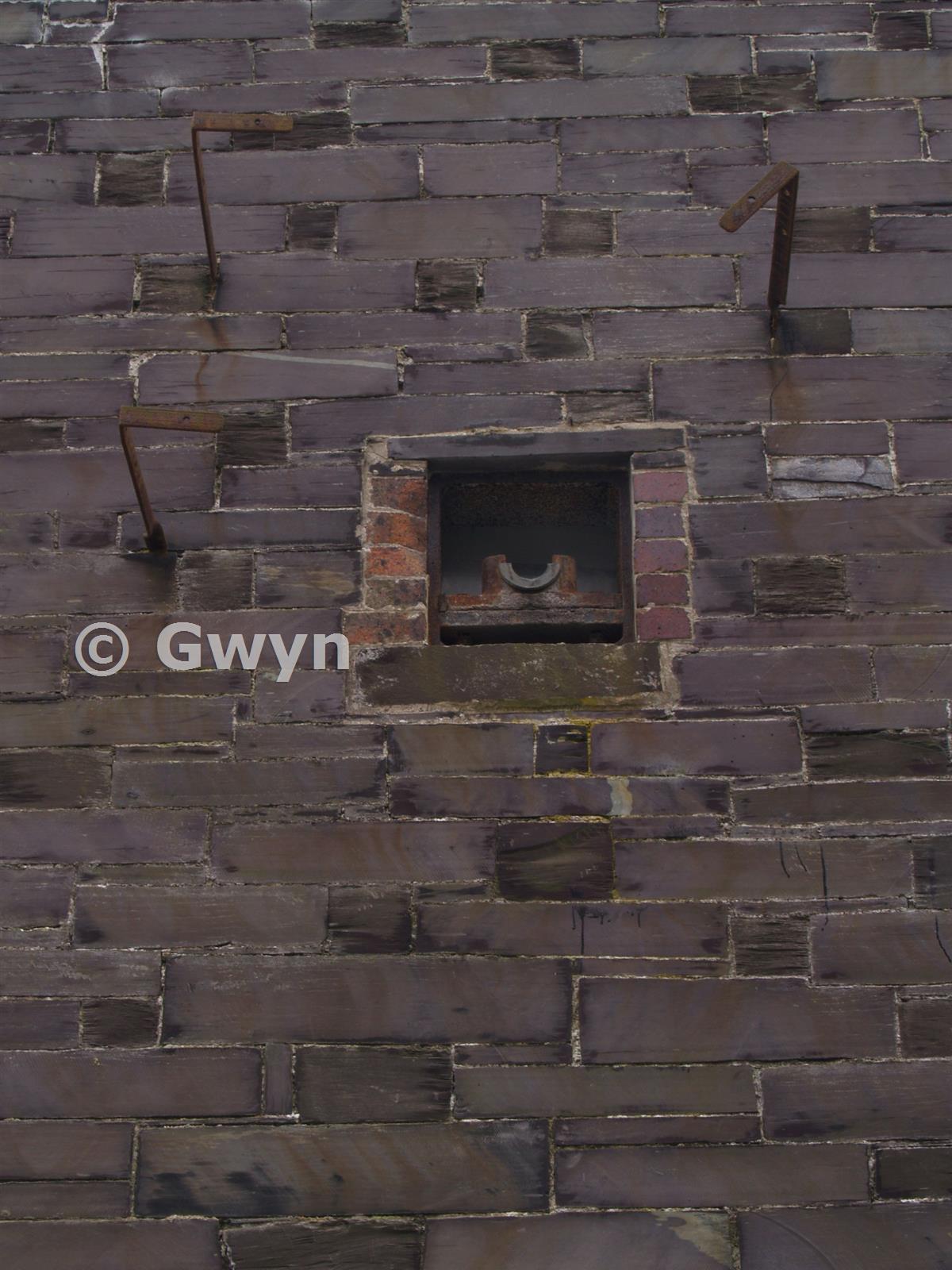 Drive shaft bearing in N. gable-end of building. Architectural detail. Mill complex.