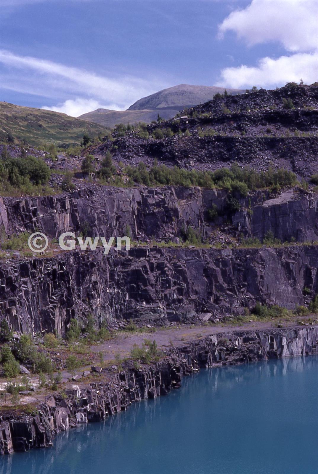 Landscape. View looking S. Trees. Ecology. Terraces. Flooded pit. Water. Carnedd Dafydd. Scanned off Fujichrome.