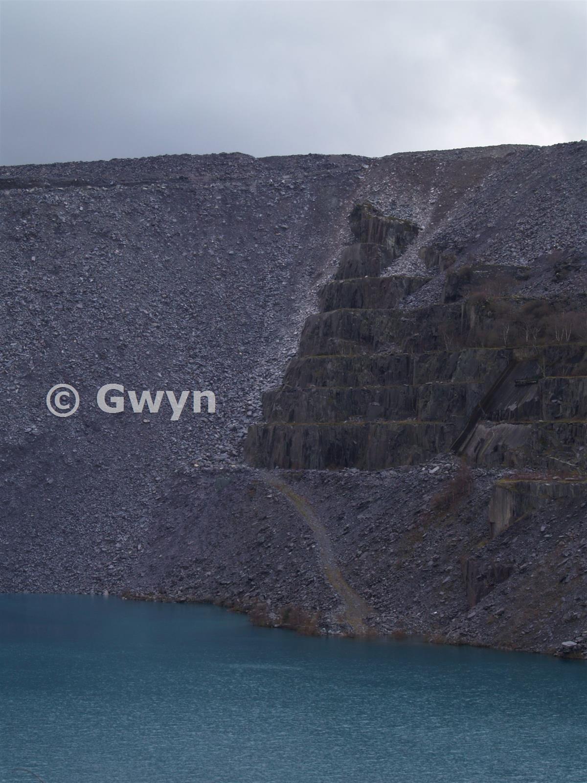 Landscape. View from E. Flooded pit. Waste slate. Tips. Terracing. Subduction.