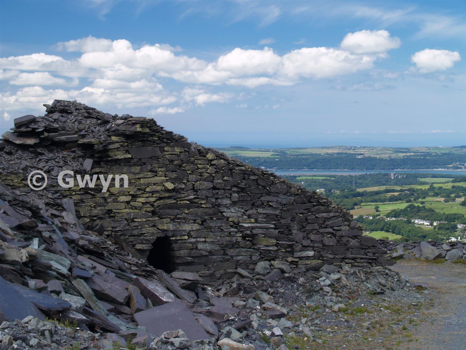 Remains of incline on Vronllwyd. Penrhyn Castle can just be seen on the right, Anglesey in the distance.