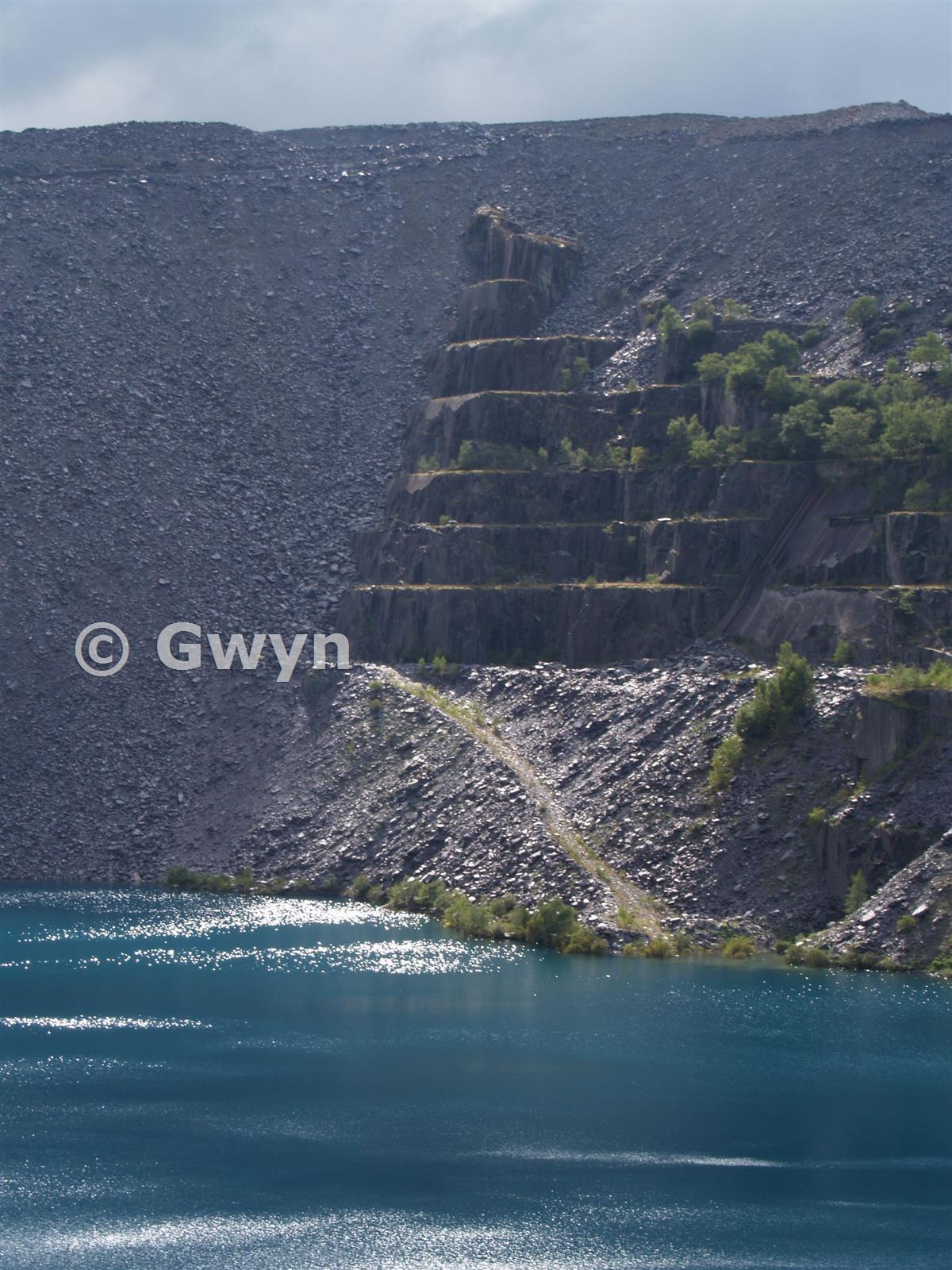Landscape detail of flooded pit and old terracing, now being subsumed by modern tipping. The modern quarry is over the horizon of waste slate.
