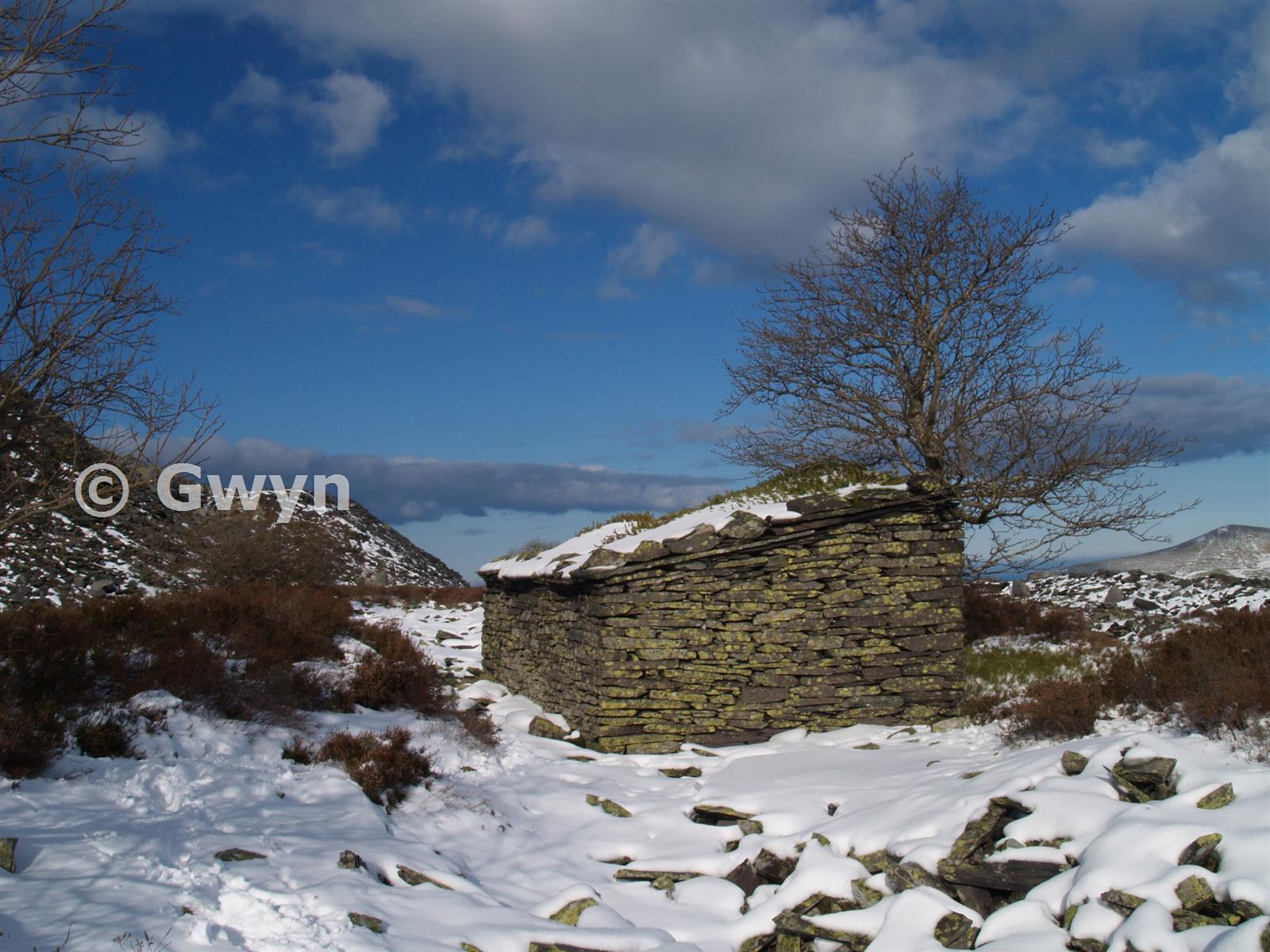 Landscape detail, looking N.Old caban on top level of S. facing tip runs i.e. Nant Ffrancon. Tree. Lichen. Snow. 4.2.09.