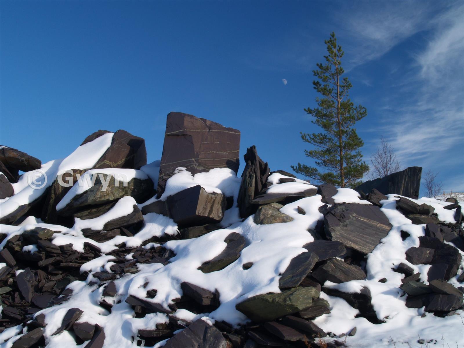 Landscape detail.Waste slate tips. Naturally regenerated pine tree. Snow. Moon rise. 4.2.09.