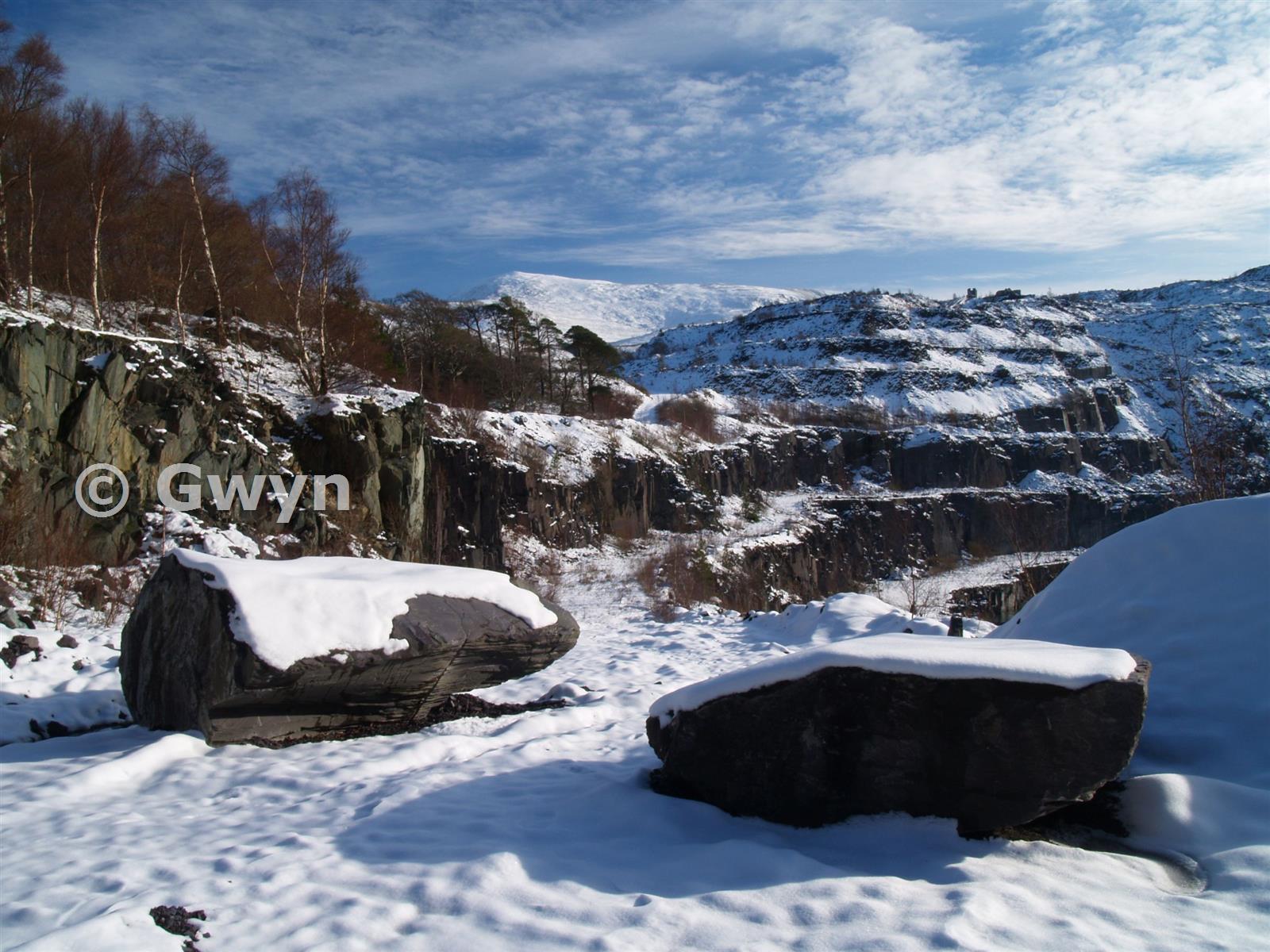 Landscape view looking S. over old workings. Carnedd Dafydd in the distance. Terracing. Trees. Snow. 4.2.09.