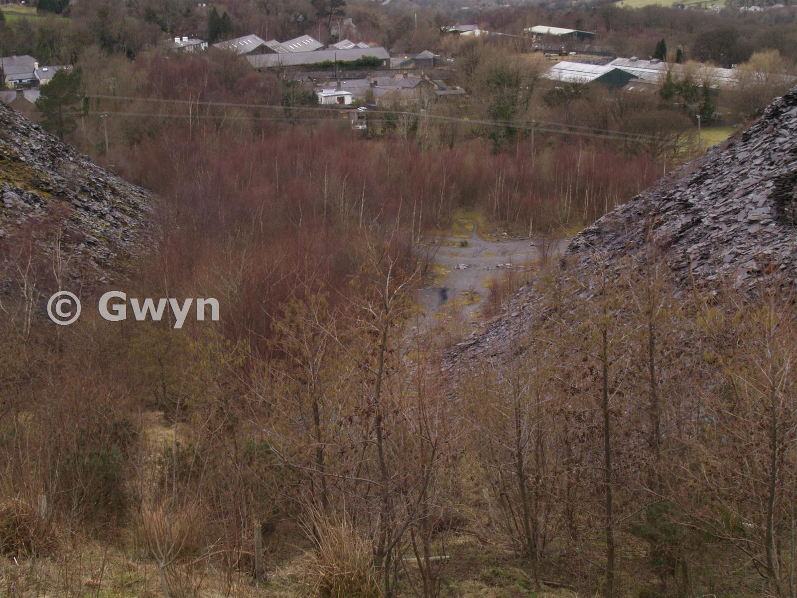 Landscape view looking N.W. towards Felin Fawr mill complex, which can be seen, top of picture. This was the site of the incline down from the Red Lion Level to the connecting railway, on the level, at the bottom. Trees. Restoration.