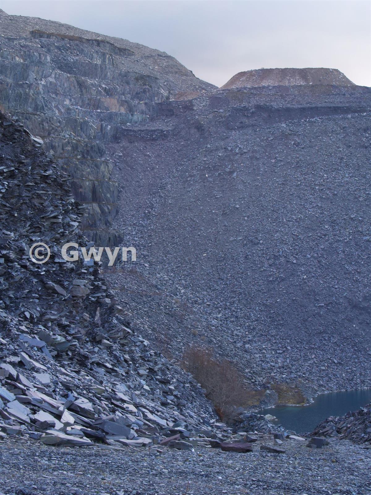 Landscape view from the E. of the tipping from the modern workings. Note the unstable nature of the old tips, left, foreground. March, 2009.