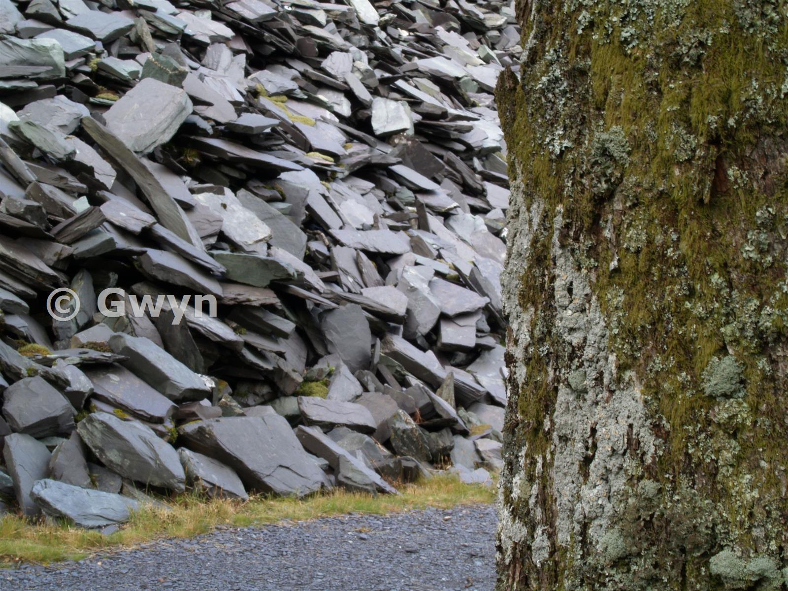 Waste slate and oak tree trunk next to Lon Las Ogwen. Ecology. Access. Landscape detail. Lichen.