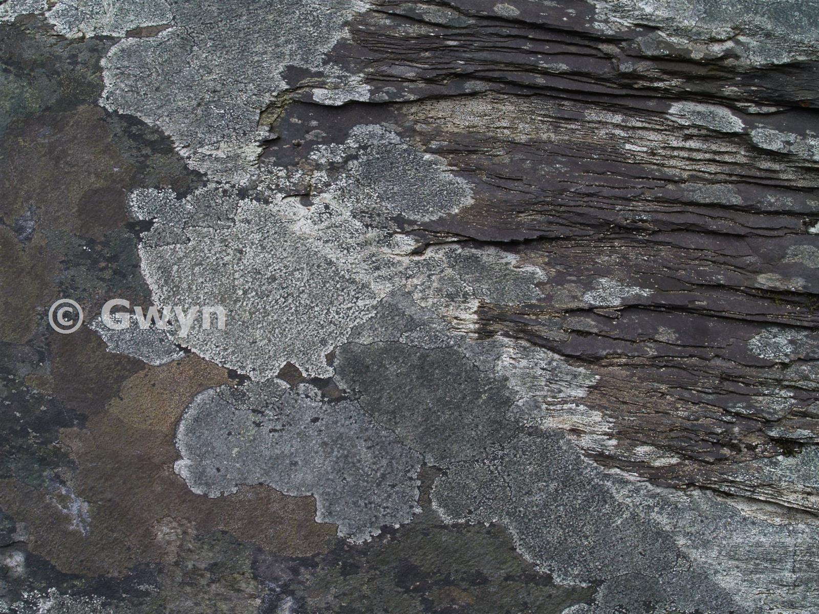 Lichen on block of waste slate. Ecology. Lichens take many years to grow and can give valuable information relating to site age and conditions.