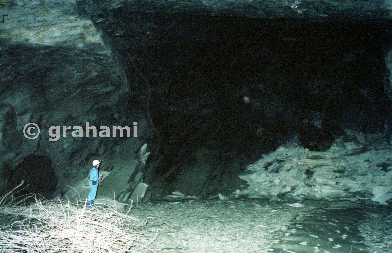 Chamber B8 New Vein, nothing to do with long worked away floor B, but a nomenclature used for chambers east of Chamber No. 1 To Wil's left is the level to chamber B9, while the steps on the right lead up to a strange level which crossed over the top of the Floor G Drainage Adit "Lefel Dwr" and gained access to some other New vein chambers on the other side.