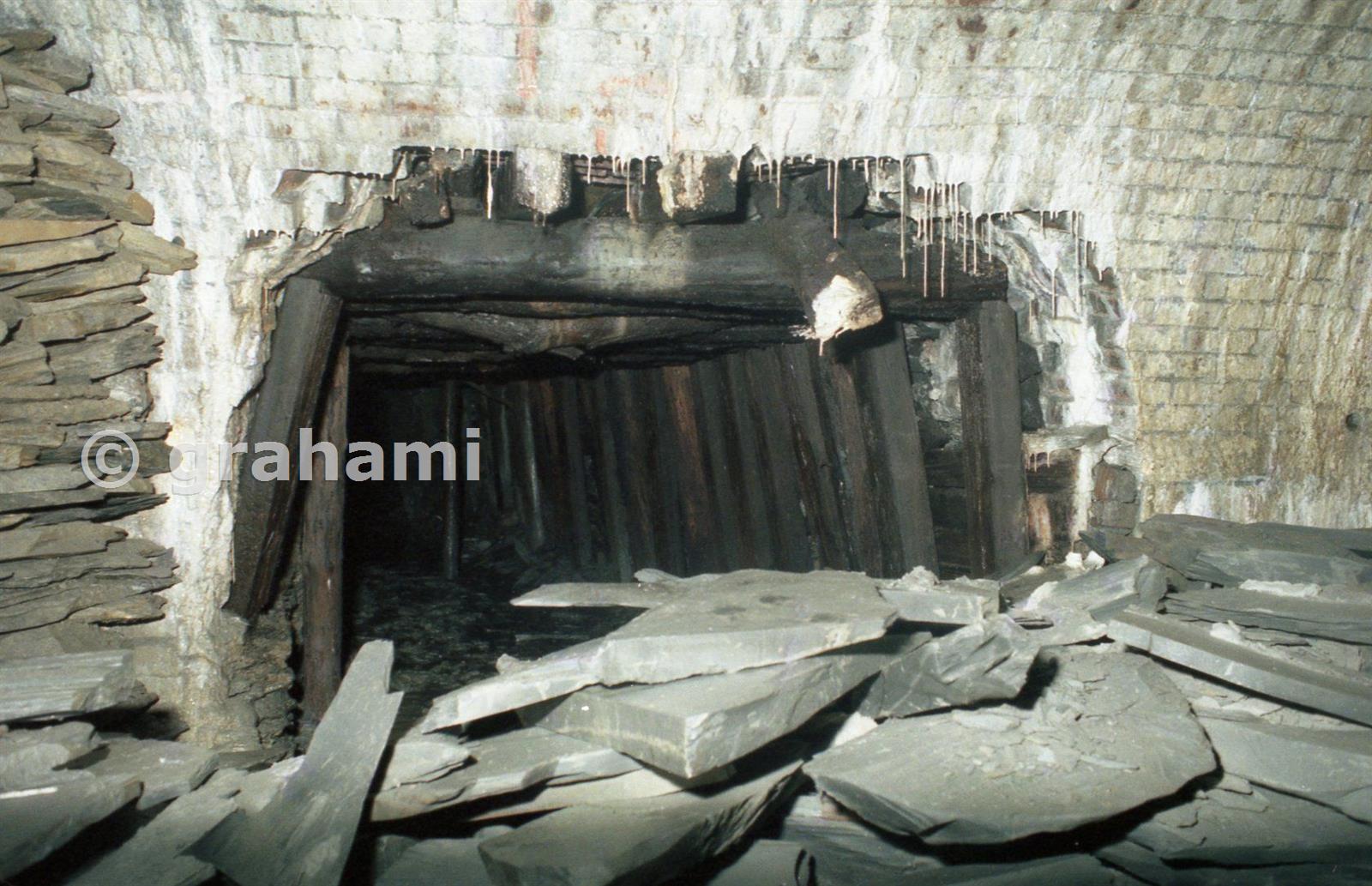 just by the start of the packing, the east wall of the Archway had been breached and a timbered level led to a small number of chambers. It was called the "Pensioner's Level" because the quarry pensioners (who worked into their 70's) could easily get to it and get slabs to make slates from it to eke out their pension.