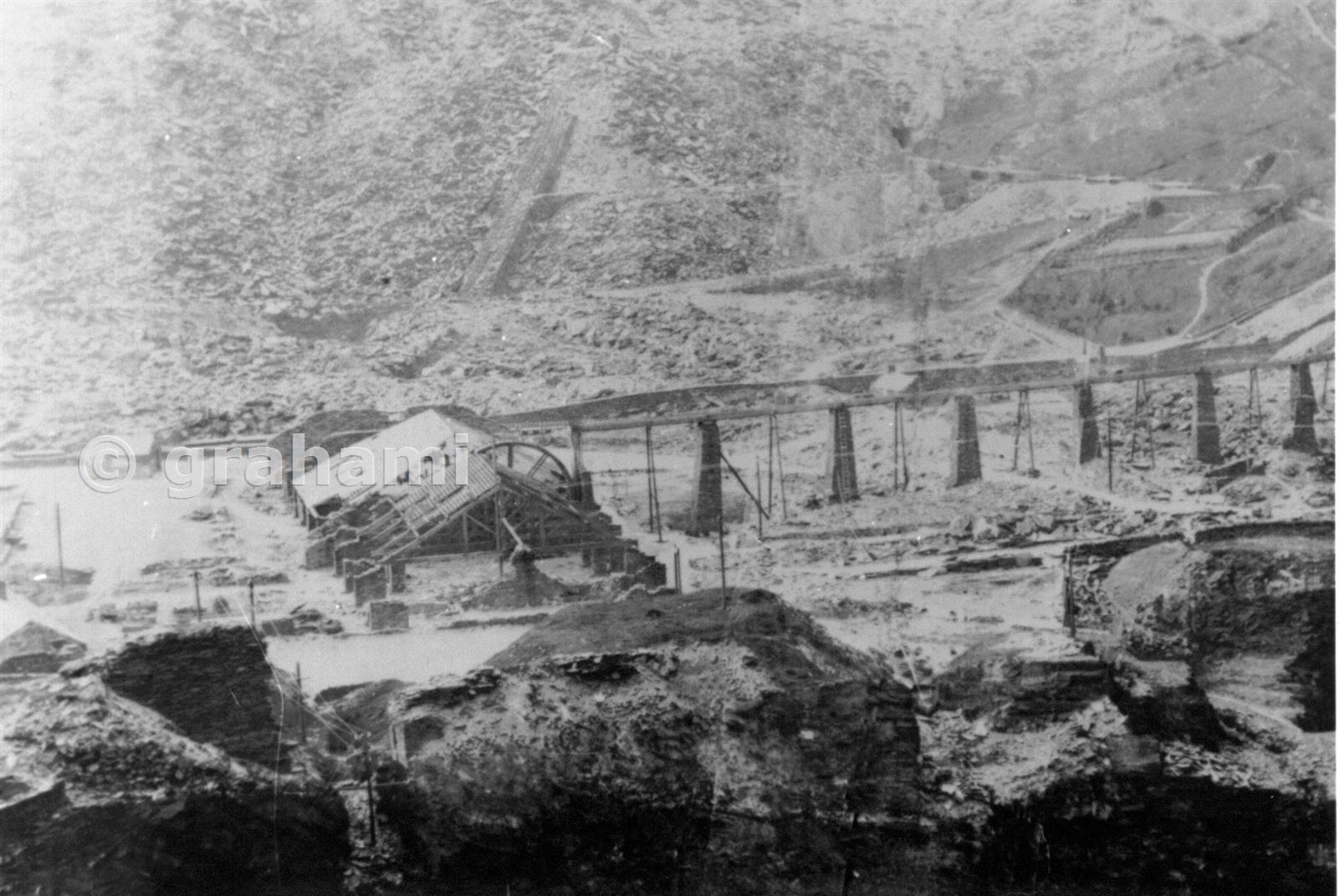 Enlargement from a glass negative print. This mill originally was built for Votty & Bowydd - it was probably their first mill, as it was always known as "Percival's Mill" after the owning family. With the abandonment of old Hafodty by 1870, and the development of workings below its horizon on A, B and C floors, it had no use and so was leased to the Maenofferen Company, along with the wharf around it, and the tramways connecting to it along Cookes Level. By the time of this phot it was derelict, all the machinery and work having been removed to the present Maenofferen mills floor. It is interesting to see the waterwheel, it's launder bringing water from the adit in the background which itself was fed from the old Hafodty quarry. The far end of the mill was labelled "Hunter Saw" on the original lease plan. Immediately above the mill can be seen the remains of one of the inclines from old Hafodty to the Rhiwbach tramway.