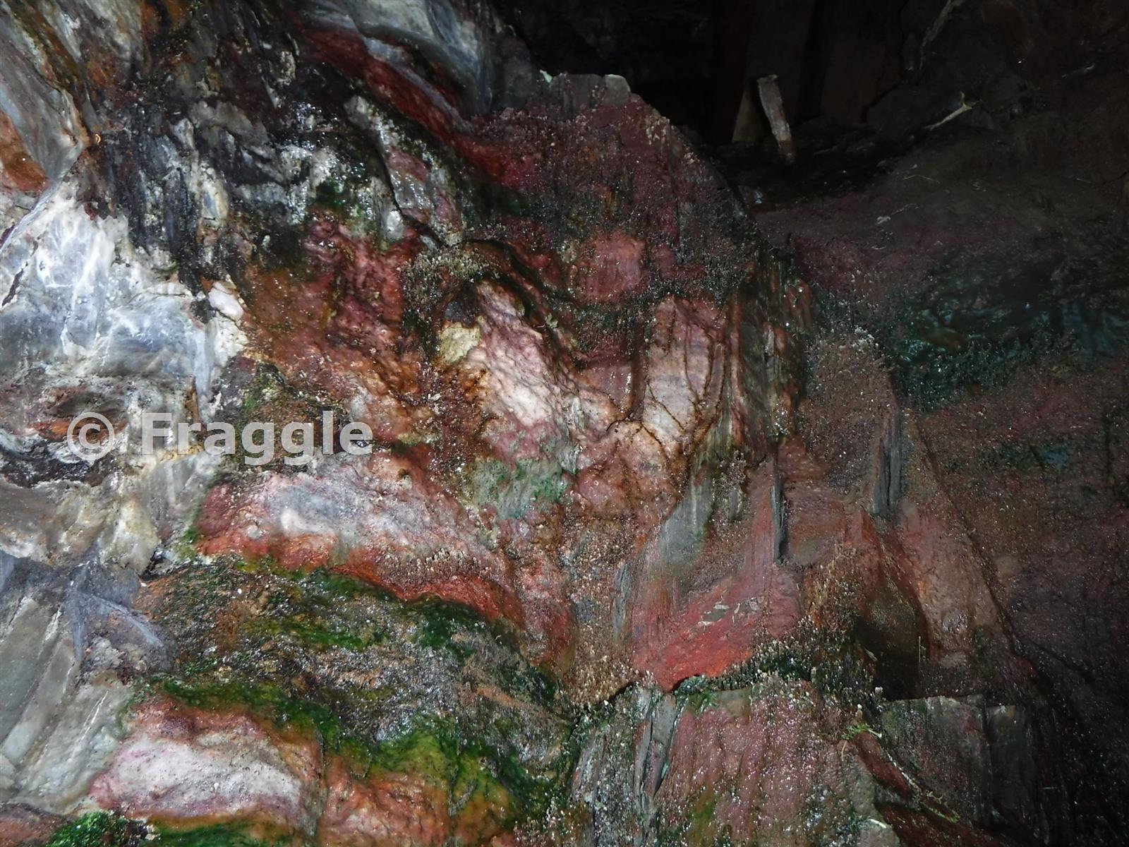 Formations on the walls at the entrance with natural growth on top giving a strange contrast in red and green colours.