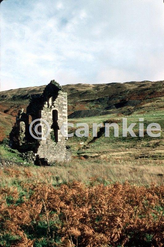 Pibble Mine engine house, 5 km. east-north-east of Creetown, on the north-west slope of Pibble Hill, Kirkudbrightshire. Spoil heaps from adits and shafts into the hillside are seen to the right of the engine house. From the size of the dumps a considerable amount of work has been carried on, several levels and shafts have been driven and sunk to the vein. The material on the dump is mainly black graphitic shale; which is interesting in that it contains small crystals of zinc-blende and galena. Close by, the remains of the old washing and dressing plant can be made out. Photo P001527. Reproduced with the permission of the British Geological Survey ©NERC. All rights Reserved.