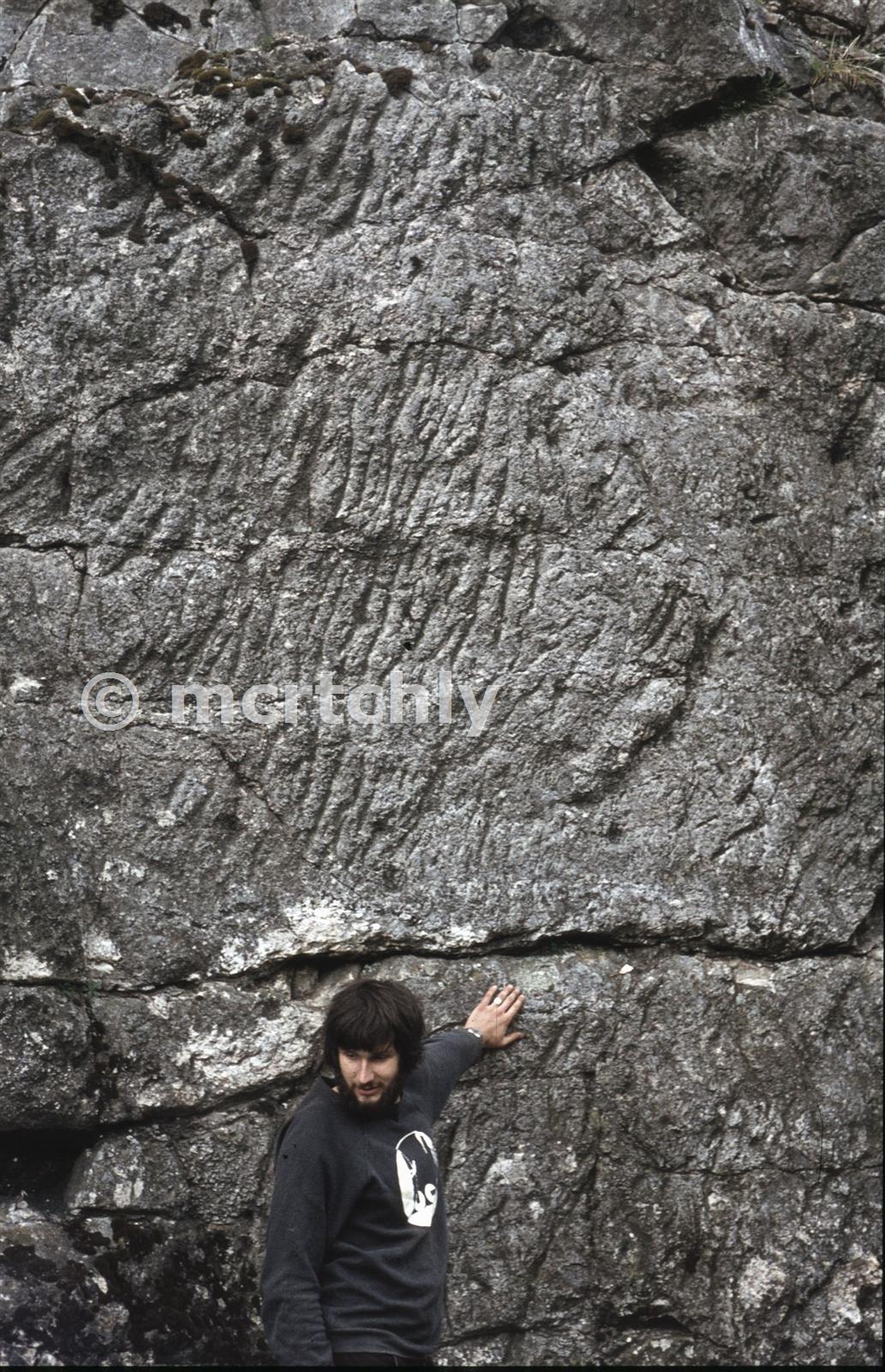 Dirtlow Rake was oiginally mined for lead ore and these pick marks along the surface exposure of the vein might be quite old. The vein was reworked for flourspar and calcite in the late C20th and much of the area has been filled in and landscaped. This photograph was taken in about 1980.