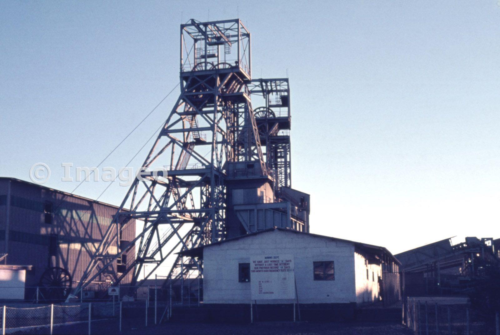 Travelling shaft in the foreground and ore hoisting shaft at rear. Lamp room in foreground ca 1978.