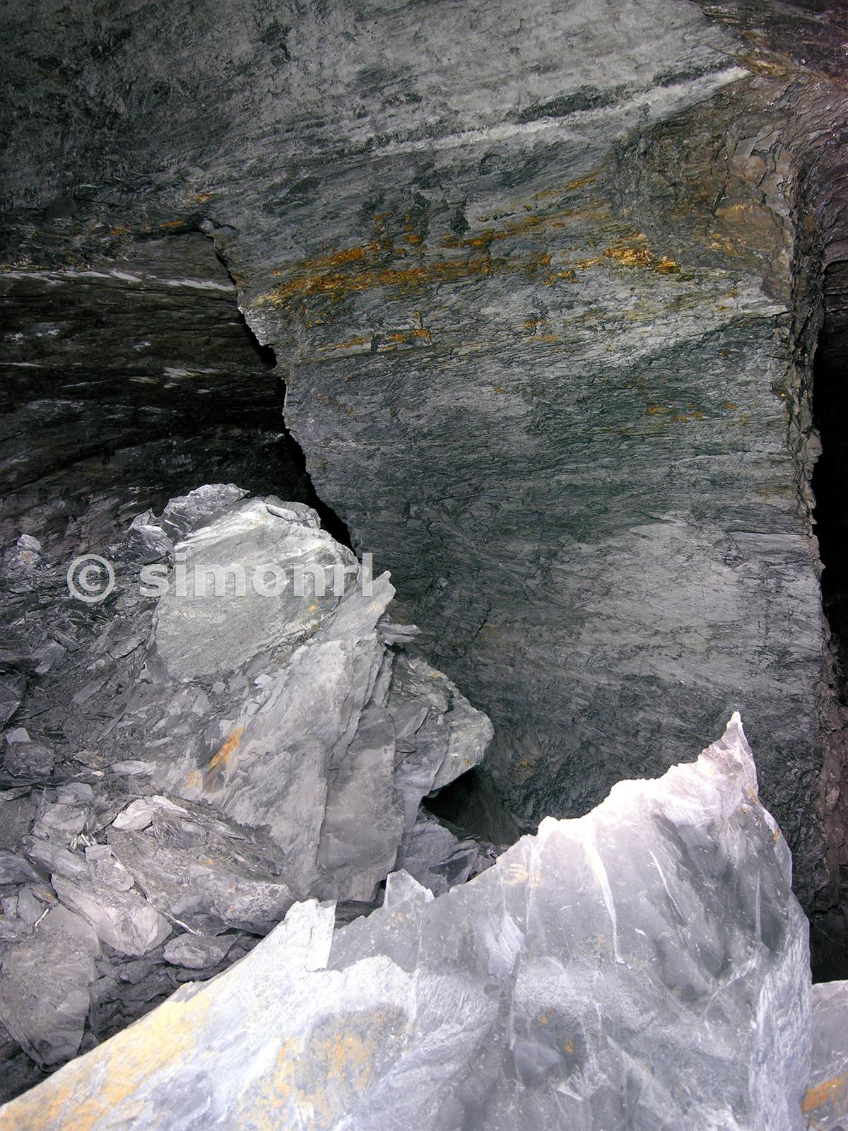 Evidence of pillar robbing in Croesor chamber 1E, the rest of the evidence (i.e. the roof) is liberally scattered around the chamber floor.