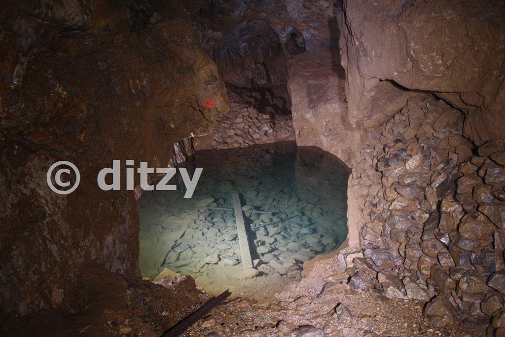 om a wet day with the plank under water. flooded stope on rhs leads to the show cave