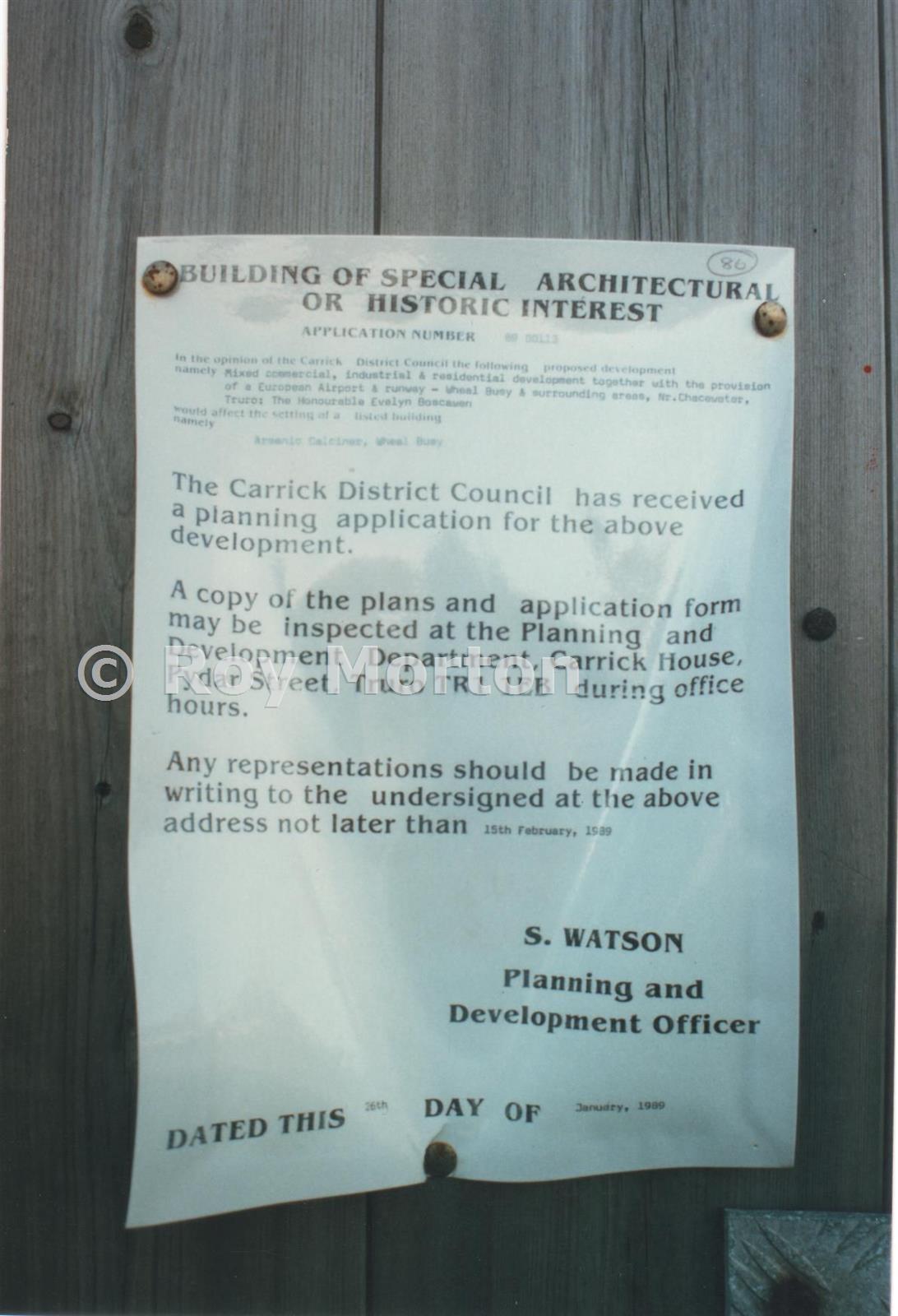 Notice for planning permission to build an airport on the Wheal Busy Mine site, which may endanger a listed building, namely the Wheal Busy calciner. This notice was posted on the door of the smithy