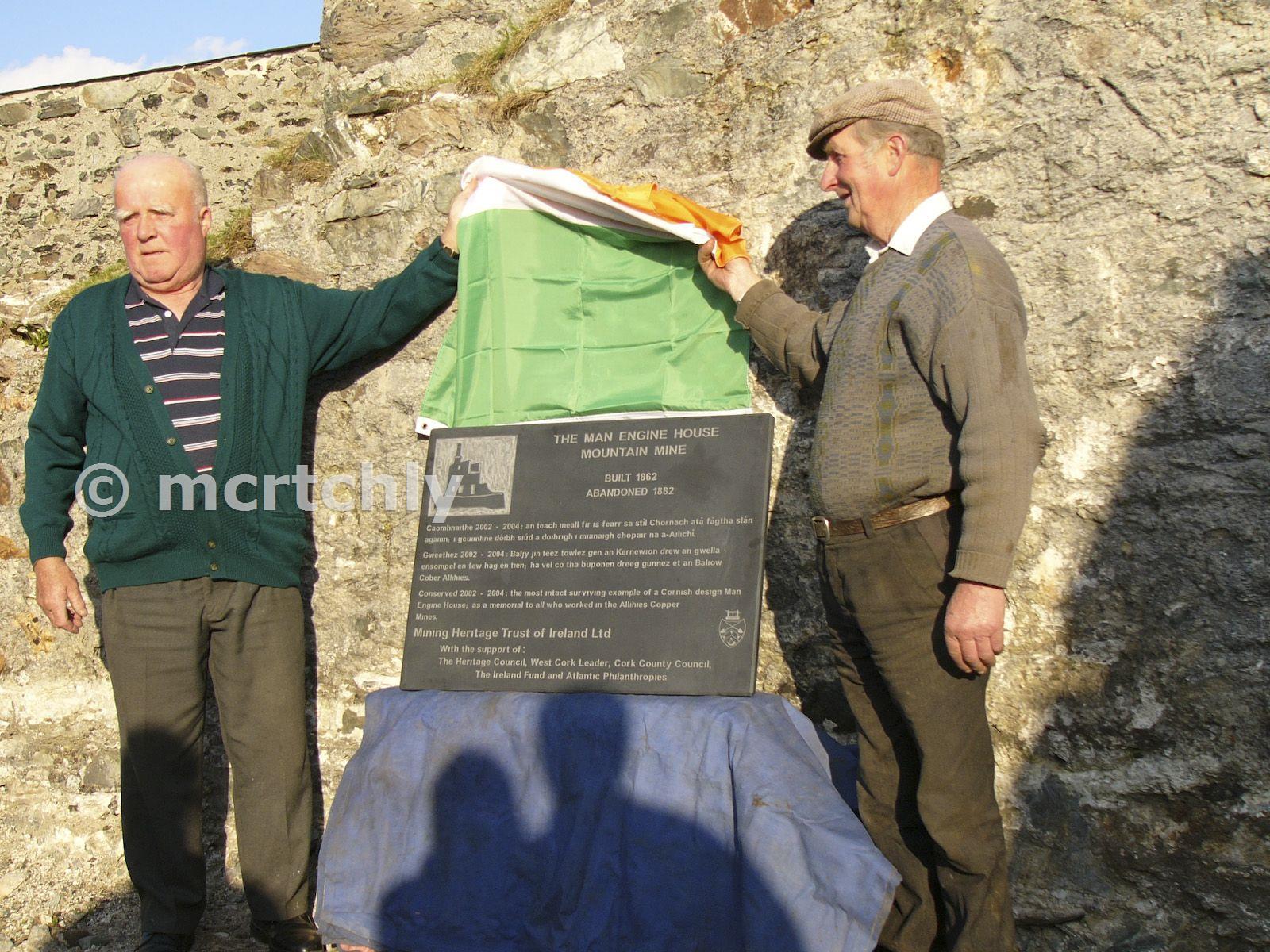 The Mountain mine man engine house was conserved by the Mining Heritage Trust of Ireland during three phases from Ocr. 2002 to May 2004. This photograph shows the unveiling of a plaque by Paddy Harrington (who worked in the mine in the 1950's) and Mr. Hodges (one the last descendants of the Cornish who worked the mine in the C19th).